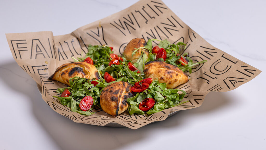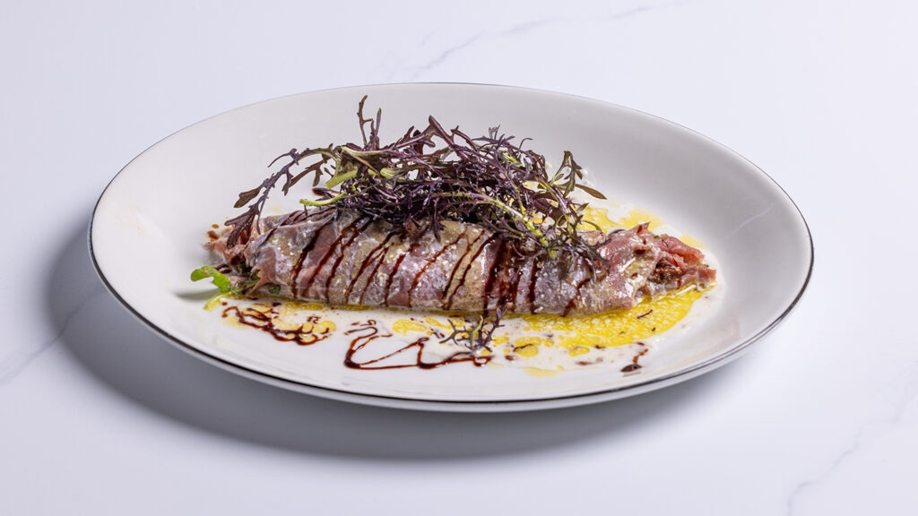 פולנטה ומוצרלה פריכות, קרם פרש, עגבניות שרי, ירקות ירוקים, פילה לימון, בצל ירוק, בזיליקום ופלפל חריף