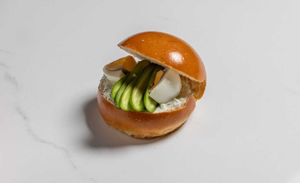 איולי חרדל, צזיקי, ביצה קשה, מלפפון.