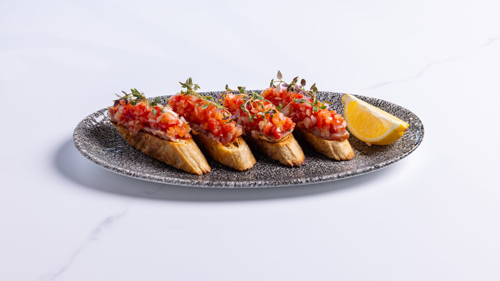 ברוסקטת פרמז'ן, איולי חרדל, קורנישונים, בצלי שאלוט, עגבניות שרי, ארוגולה קצוצה וצ'ילי חריף