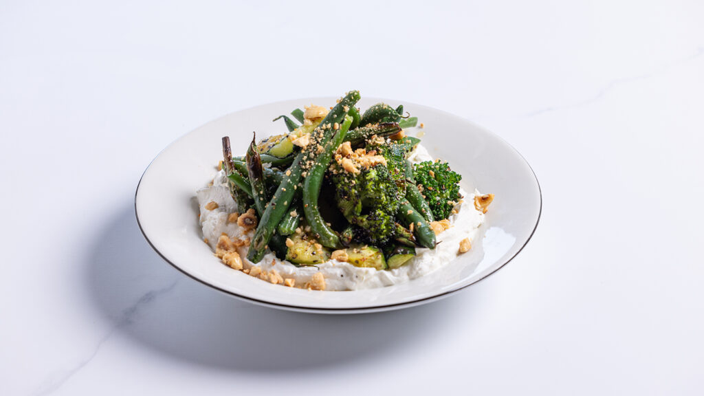 קרם לבנה, ירוקים מהטאבון (שעועית, זוקיני וברוקולי), חמאת שום פטרוזיליה, קראמבל לוז קלוי