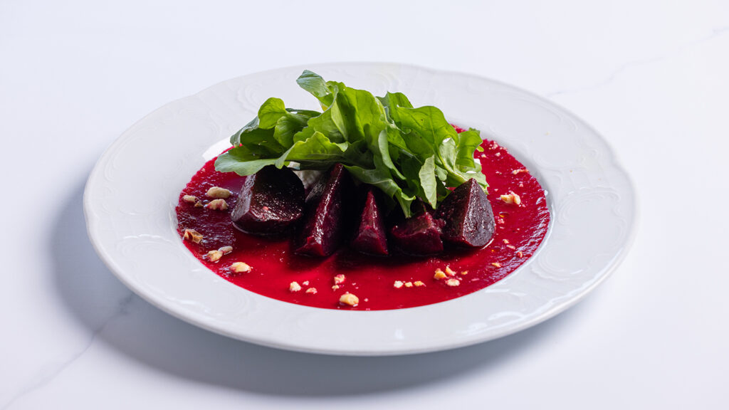 סטרטצ'לה, ויניגרט סלק תפוז, פלפל שחור ועלי מיזונה אדומה