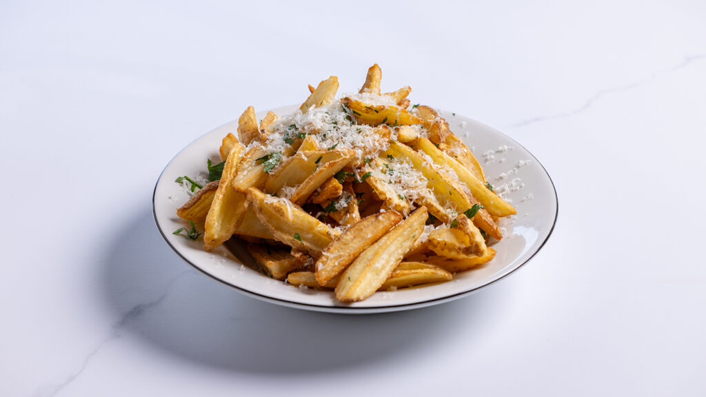 צ'יפס תפוחי אדמה פריך, שום, פטרוזיליה, מלח ים, פרמז׳ן וגרידת לימון