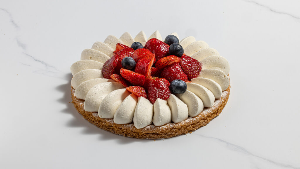 סבלה ברטון, קרמו שוקולד לבן, תותים טריים, אוכמניות טריות בעיטור שנטילי וניל. (קוטר 20)